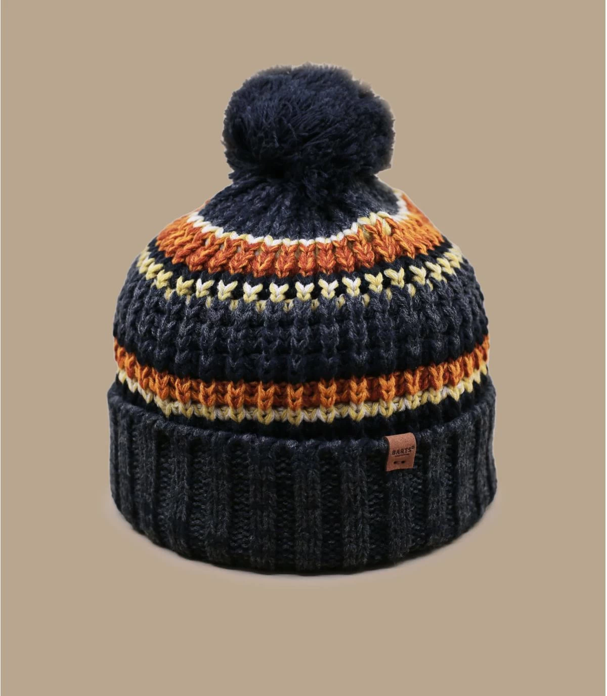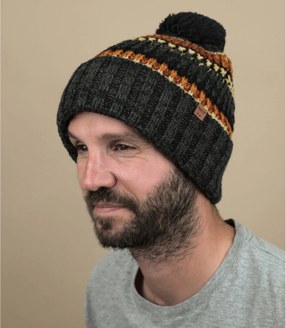 Schützen Sie sich diesen Winter vor der Kälte, indem Sie diese marineblaue Bommelmütze mit Streifen, gelb und schwarz und einer großen Bommel tragen. Dieses umweltbewusste Accessoire enthält recycelte Materialien.