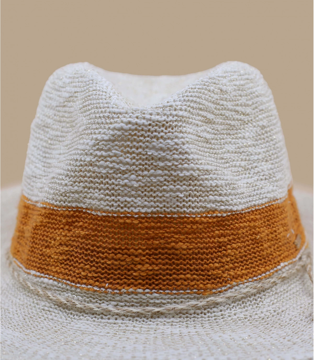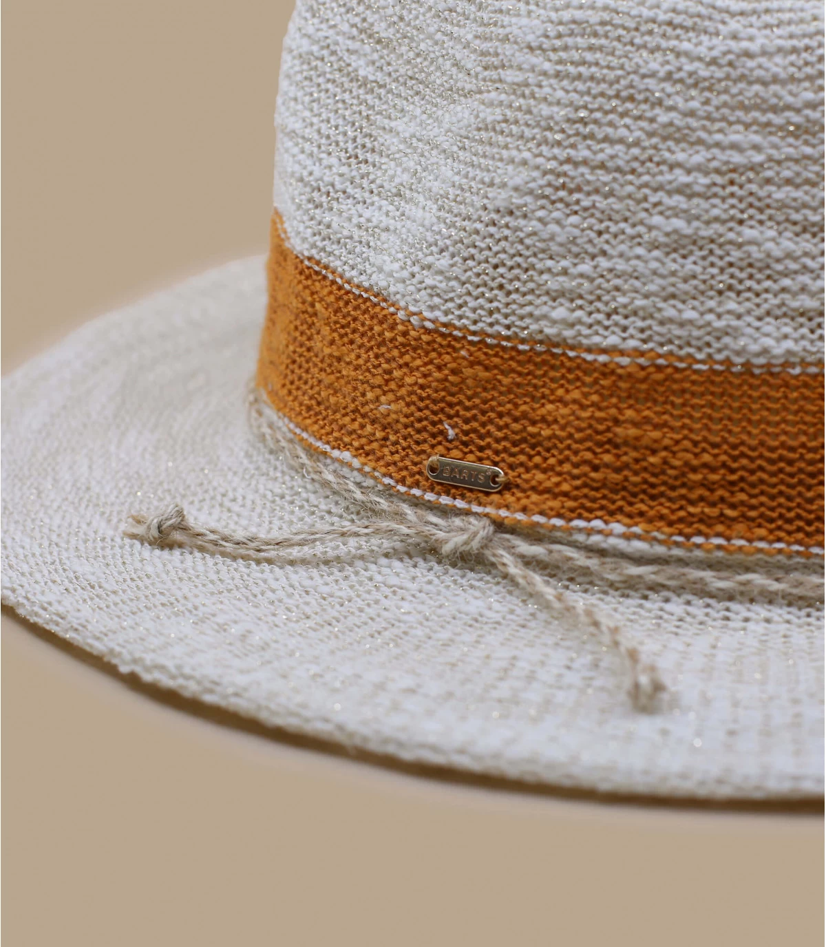 Bleiben Sie auf elegante Weise vor der Sonne geschützt, indem Sie diesen Damen Fedora Hut aus Baumwolle tragen. Es ist ein sehr eleganter cremefarbener Strandhut. Er ist mit einem orangefarbenen Hutband und einer Kordel verziert.