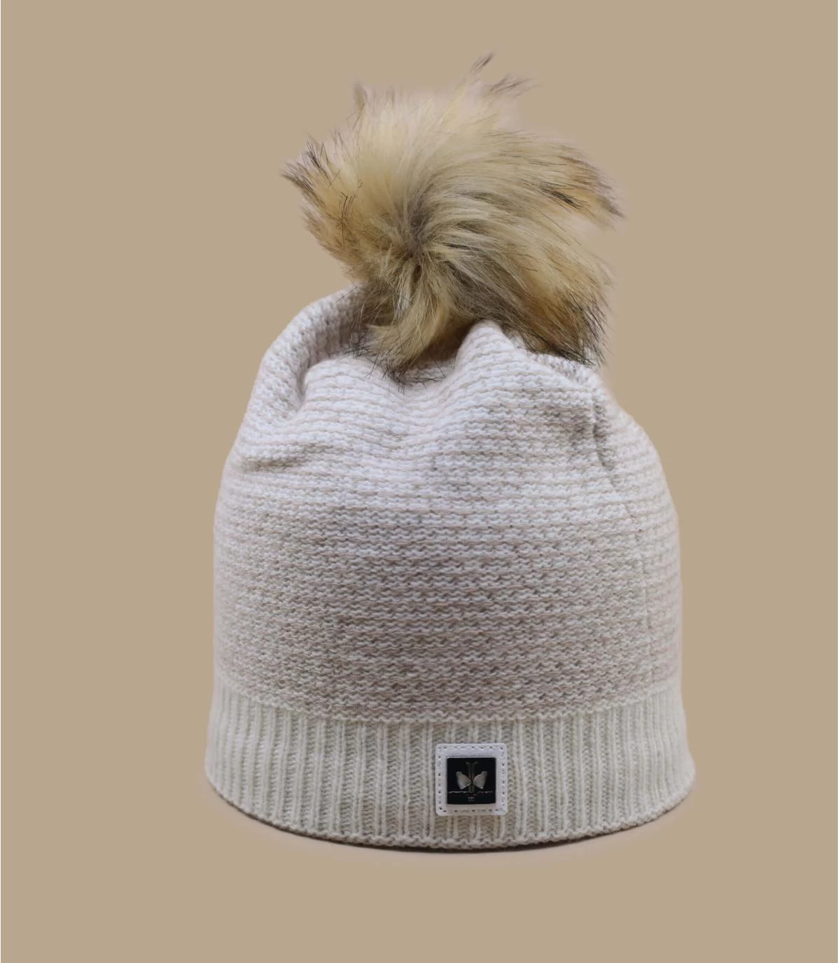 Tragen Sie diese schlichte cremefarbene Mütze mit ihrem buschigen Bommel. Sie wurde in Frankreich aus recycelter Wolle hergestellt und wird Sie diesen Winter nicht mehr verlassen. Die beige Farbe lässt sich leicht mit anderen Accessoires kombinieren.