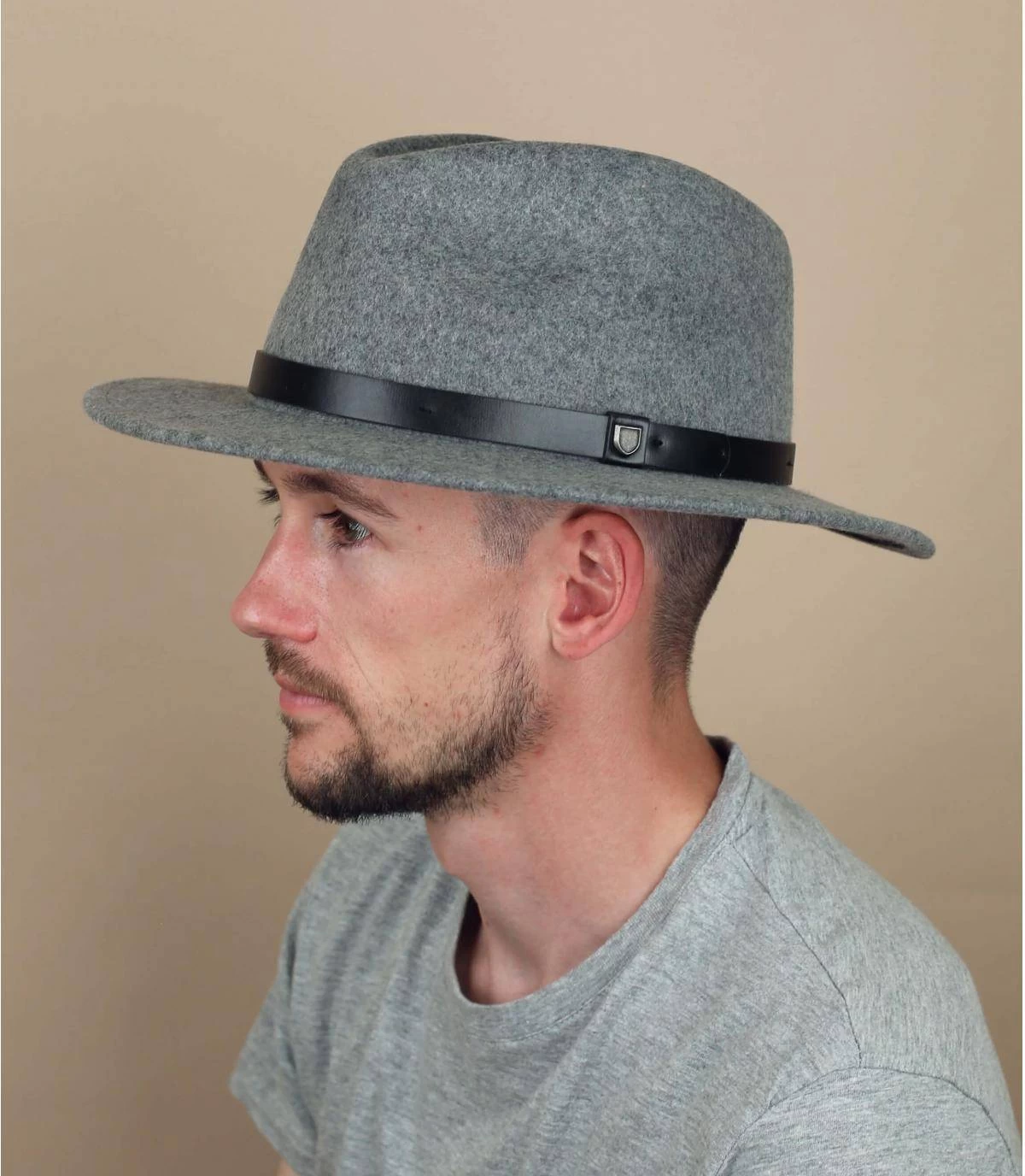 Cet élégant fedora en feutre gris chiné de la marque hollywoodienne Brixton est relevé d’un galon effet cuir et d’un petit écusson en métal. Il s’ajuste à l’intérieur par un système de velcro.