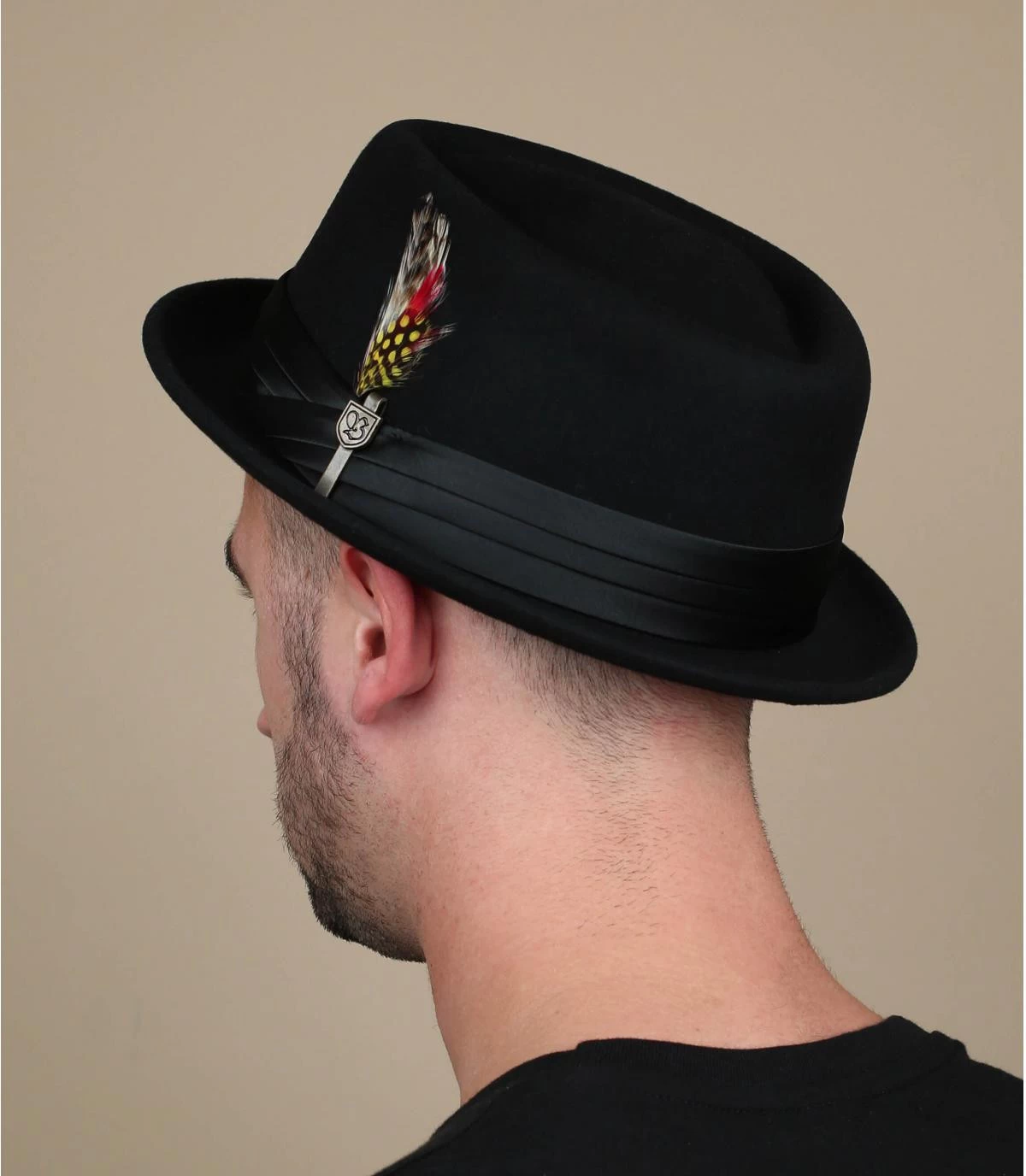 Schwarzer Filzhut mit schmaler leicht erhöhter Krempe. Breites schwarzes Hutband um die Basis und pflaumenfarbener Knoten und Brixton Logo auf der linken Seite.