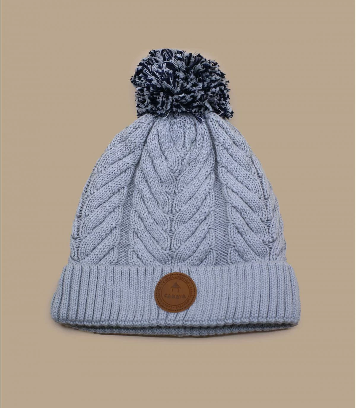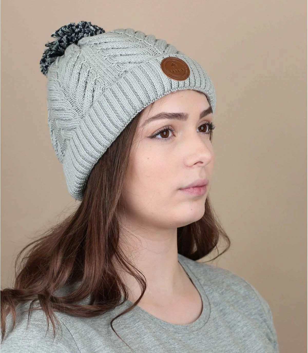Sehr schick und nicht zu warm, dank des weichen Bio-Baumwollstoffs. Diese schöne graue Mütze hat ein schönes Fischgrätmuster und ist mit einem schönen runden Lederpatch und drei austauschbaren Bommeln versehen.
