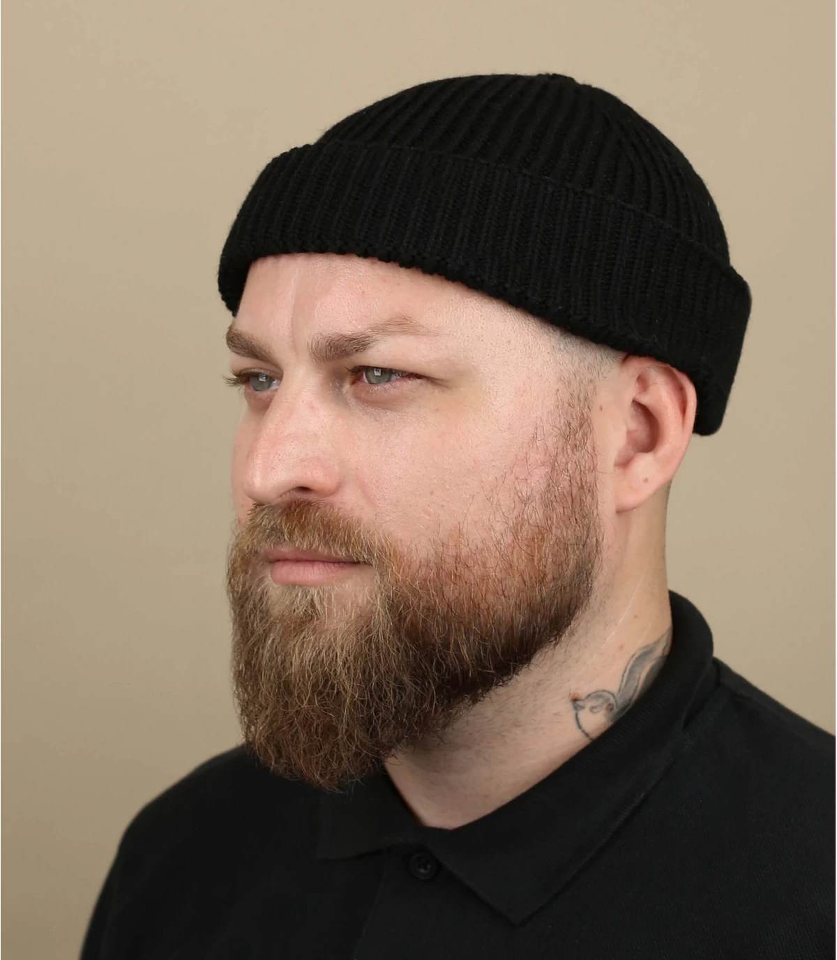 Schwarze Dockermütze, die nur den oberen Teil der Ohren bedeckt. Material: halb recyceltes Polyester, halb Acryl. Einheitsgröße: 55-60 cm Kopfumfang.
