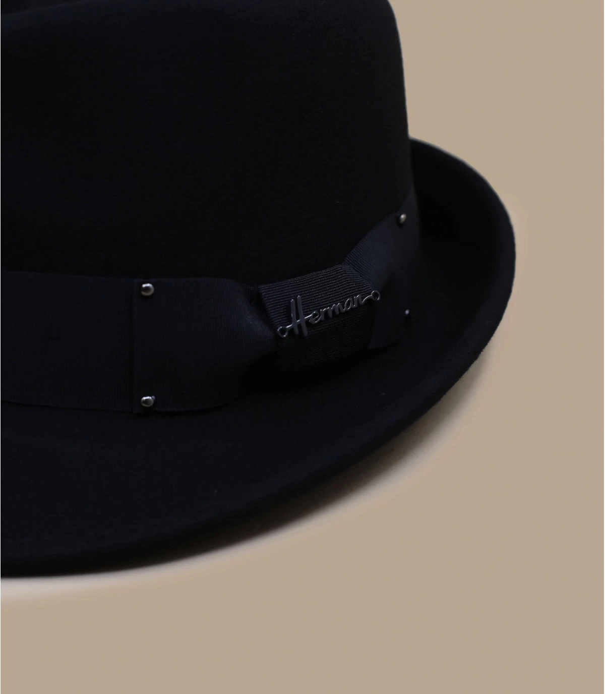 Die Eleganz der Farbe Schwarz und die Qualität eines Wollfilzes vereinen sich in diesem wunderschönen Trilby Hut von der spezialisierten Marke Herman, der mit einer breiten, seitlich gebundenen, Ton in Ton abgestimmten Hutband hervorgehoben wird. Ein Klassiker, der perfekt zu Ihrem Outfit passt.