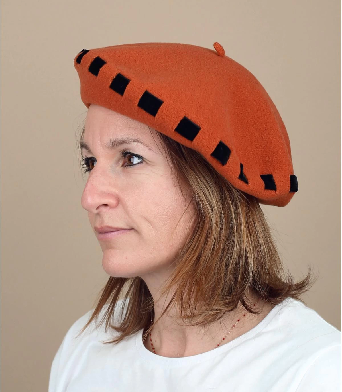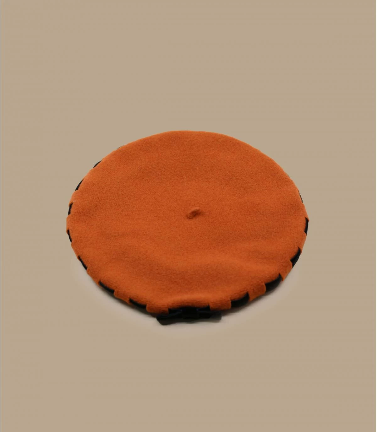 Wenn Sie sowohl einzigartig als elegant aussehen möchten, dann nehmen Sie diese prächtige Baskenmütze aus Merinowolle der Marke Laulhère mit einem schönen orangen Farbton, der Ihre kalten Tage aufwärmen wird. Sie ist von einem bezaubernden gebundenen Samtband gekrönt.