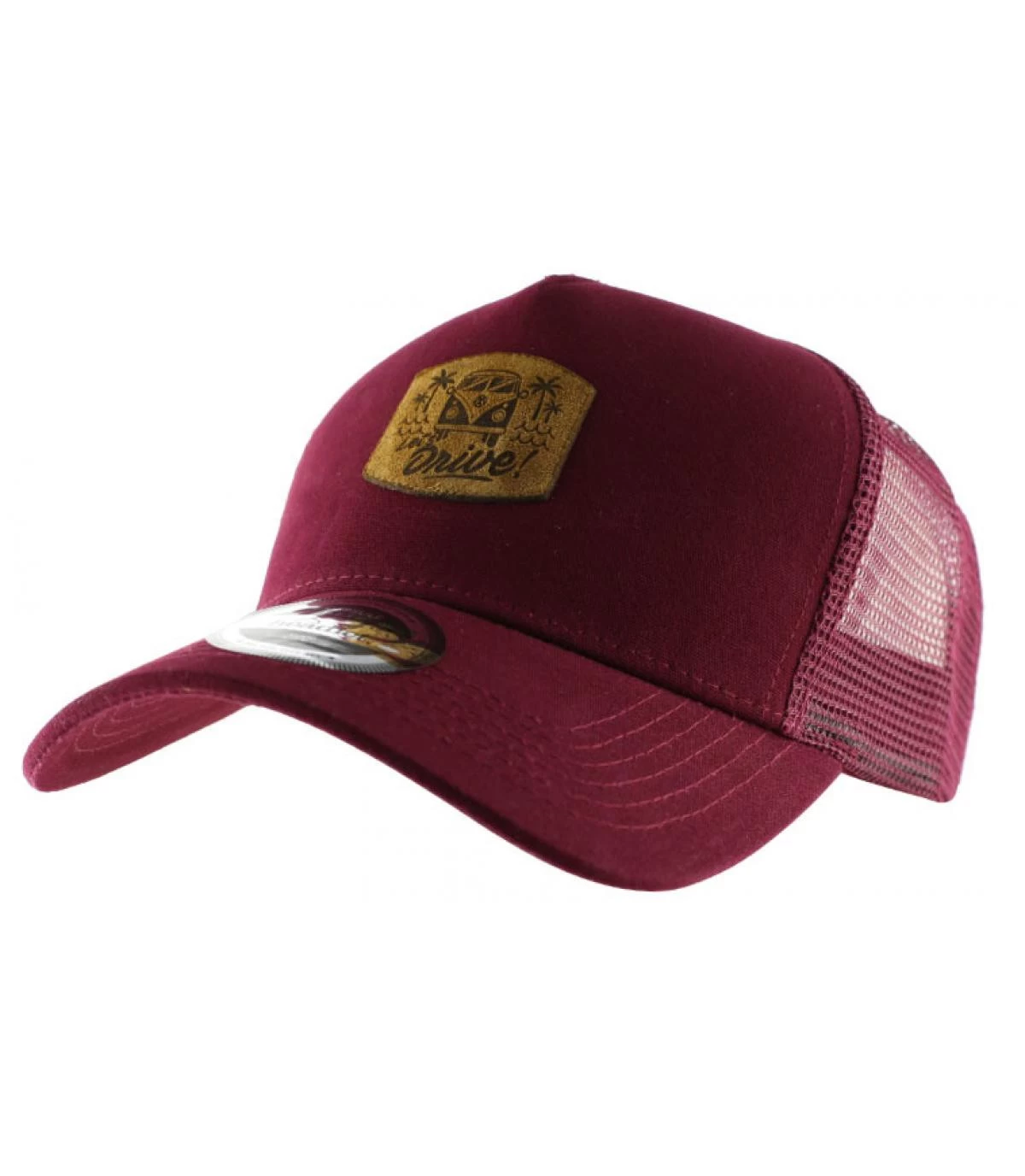 Eine bordeaux rote Trucker, ultra trendy, verziert mit einem gravierten Lederpatch und einer netten Abbildung des Lieblingskombis der Surfer. Ein exklusives Modell aus der Van Life Kollektion.